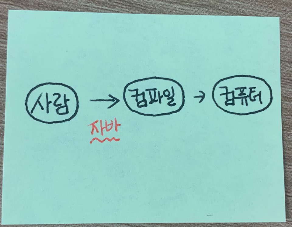 이렇게만 이해하기로 했다. 그렇게 생각하니까 내가 자바라는 언어를 공부하는데 첫번째로 컴파일이 왜 나왔는지도 납득이 되었다. 자바라는 언어를 내가 배워서 작성을 하면 컴파일이라는 통역을 통해 컴퓨터에게 전달한다. 부끄럽긴 하지만 그림을 그려서 모니터 아래 붙여두었다. 기억이 확실히 나진 않지만 아래와 같은 그림이었던 걸로 기억한다.